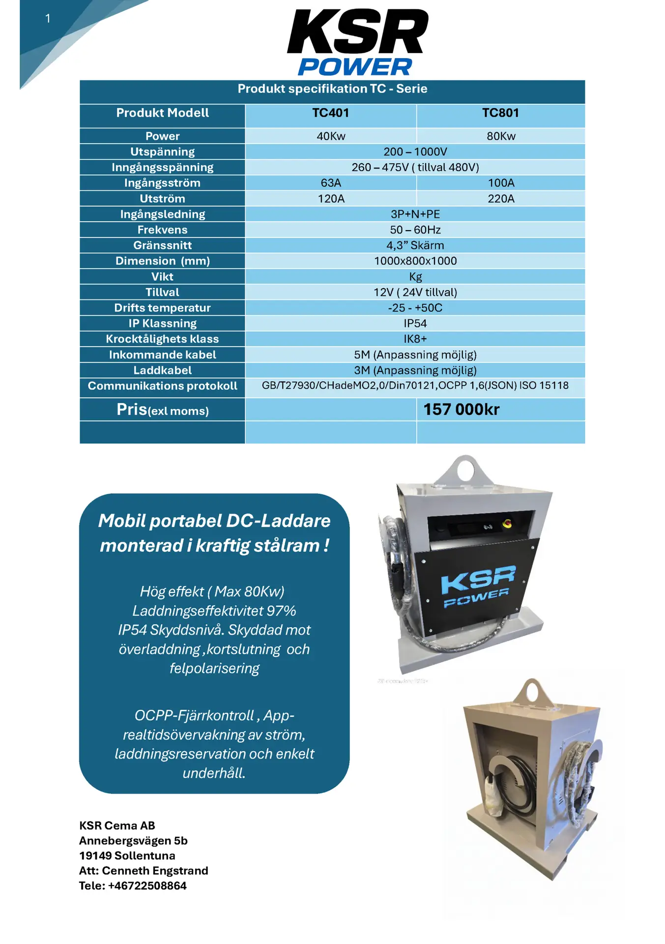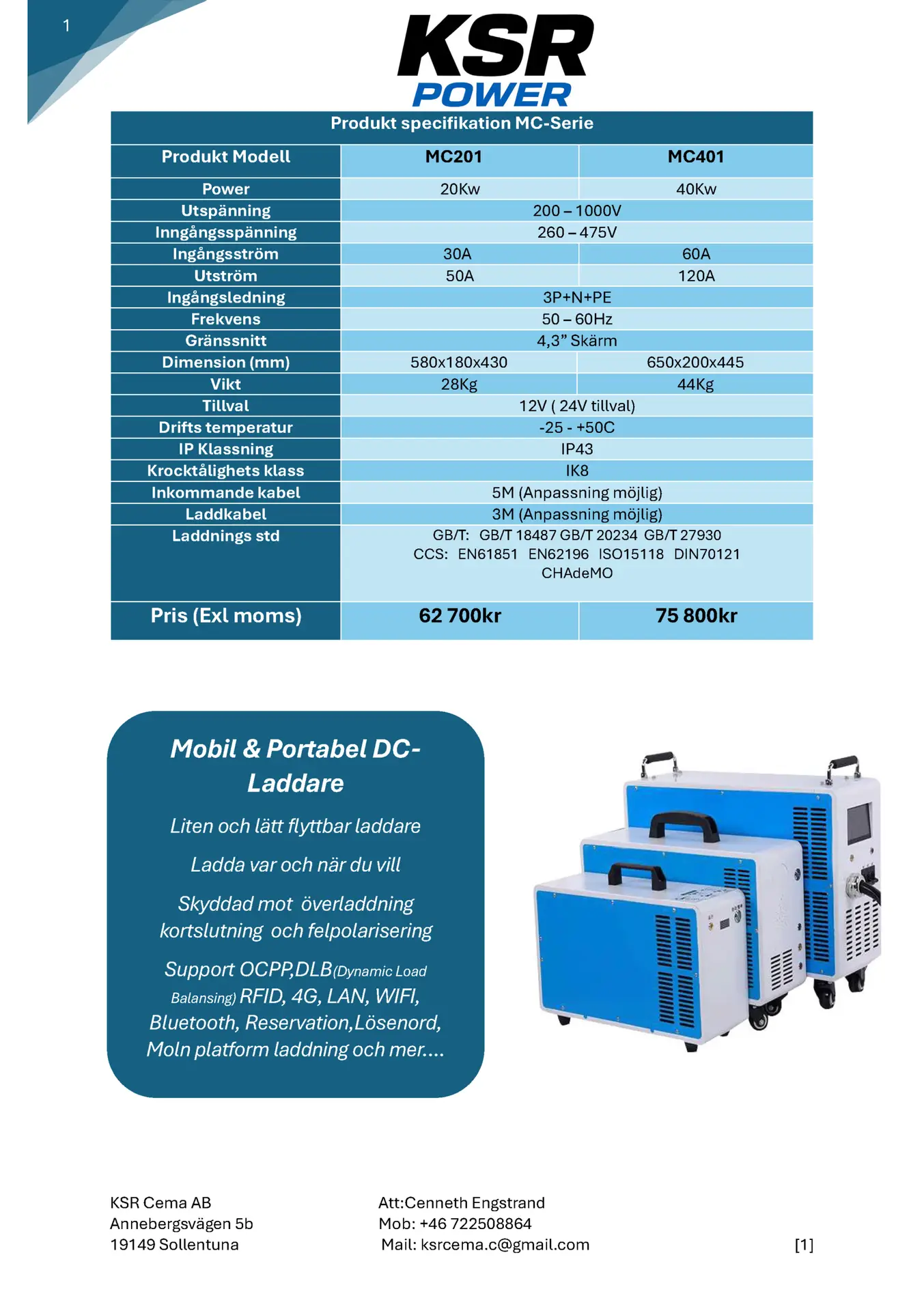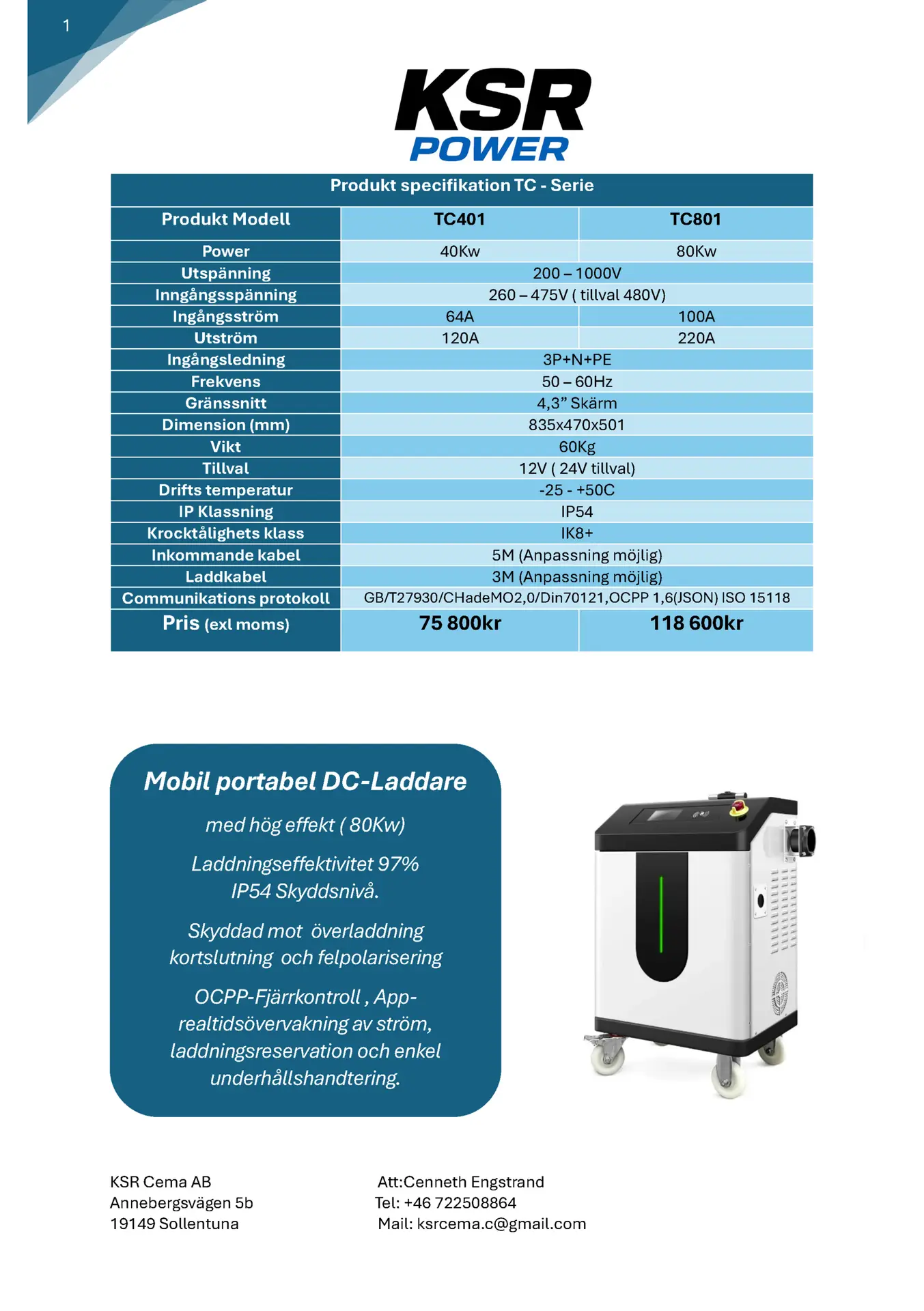Våra produkter KSR SteelX TC801 30 – 80Kw DC-Laddare inbyggd i stålram Info KSR WheelX TC801 30 – 80Kw DC-Laddare med kraftiga hjul & kabelhållare Info MC - 401 Smidig /Lätt portabel 20 – 60Kw laddare Info Ej klart Återkommer med text Återkommer med text Erfarenhet 5 stjärnig rating Snabb återkoppling Utmärkt support
